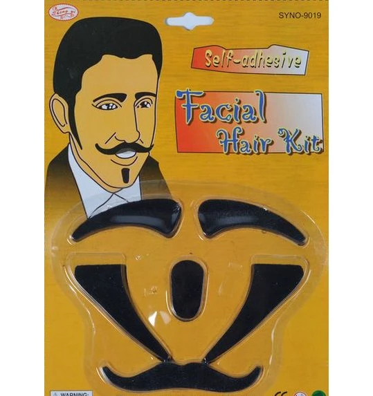 : Grappige set met zwarte wenkbrauwen, baardje, snor en bakkebaarden om op te plakken. (plakt vanzelf) |