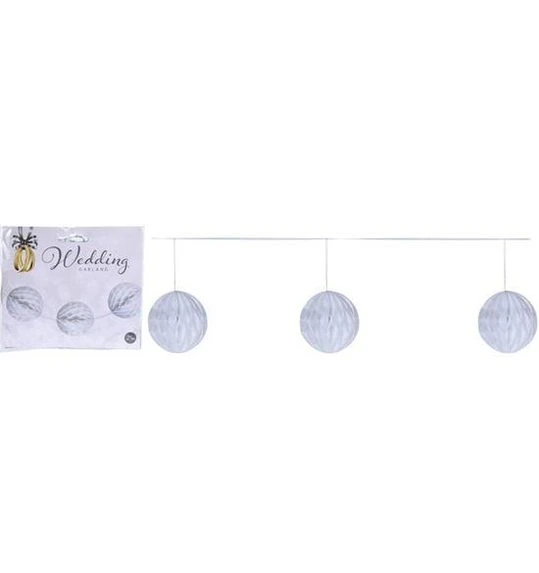 : Trouwslinger met witte honeycombs van papier. De slinger heeft een totale lengte van 2,5 meter. Ideaal voor een bruiloft! |